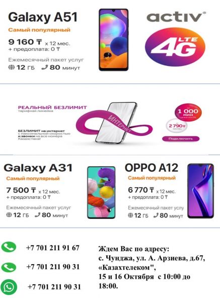 Ждем Вас по адресу: с. Чунджа, ул. А. Арзиева, д. 67, "Казахтелеком", 15 и 16 октября с 10:00 до 18:00. Здесь Вы сможете купить смартфон в РАССРОЧКУ до 24 месяцев всего от 4870тг/30дней с ПАКЕТОМ услуг (звонки и интернет) в комплекте, по результатам одобрения.