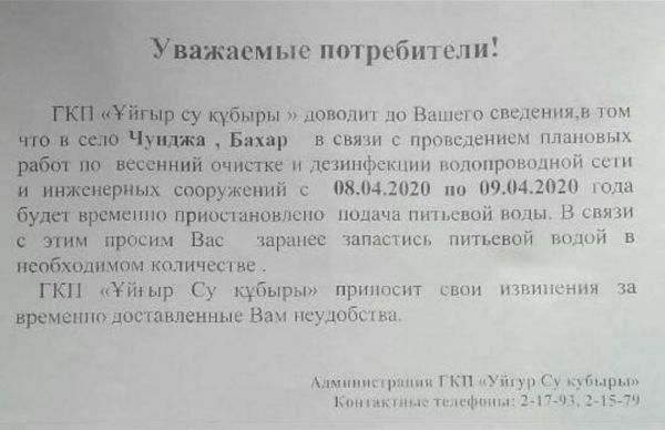 ГКП «Ұйғыр Су құбыры» доводит до Вашего сведения, о том что в сёла Чунджа, Бахар в связи с проведением плановых работ по весенней очистке и дезинфекции водопроводной сети и инженерных сооружений с 08.04.2020 по 09.04.2020 года будет временно приостановлена подача питьевой воды. В связи с этим просим Вас заранее запастись питьевой водой в необходимом количестве.