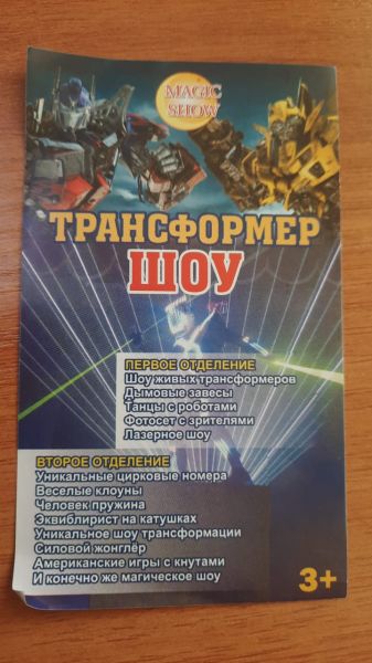 Впервые у Вас в гостях Шоу Роботов Трансформеров - Шоу живых трансформеров, лазерное шоу, танцы с роботами, а также уникальные цирковые номера: веселые клоуны, человек пружина, эквилибрист на катушках, силовой жонглёр, американская игра с кнутами, шоу трансформации и конечно же магическое шоу.