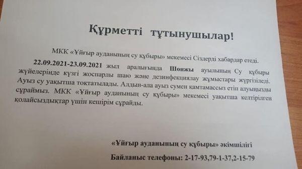 ГКП «Ұйғыр ауданының су құбыры», доводит до вашего сведения, о том что в село Чунджа в связи с проведением плановых работ по осенней очистке и дезинфекции водопроводной сети и инженерных сооружений с 22.09.2021 по 23.09.2021 года будет временно приостановлена подача питьевой воды. В связи с этим просим Вас заранее запастись питьевой водой в необходимом количестве. ГКП «Ұйғыр ауданының су құбыры» приносит свои извинения за временно доставленные Вам неудобства.